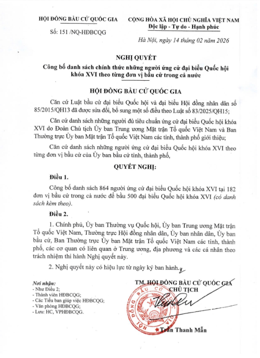 Chủ tịch Quốc hội, Chủ tịch Hội đồng bầu cử quốc gia Trần Thanh Mẫn đã ký ban hành Nghị quyết số 151/NQ-HĐBCQG ngày 14/2/2026 công bố danh sách chính thức những người ứng cử đại biểu Quốc hội khóa XVI theo từng đơn vị bầu cử trong cả nước.