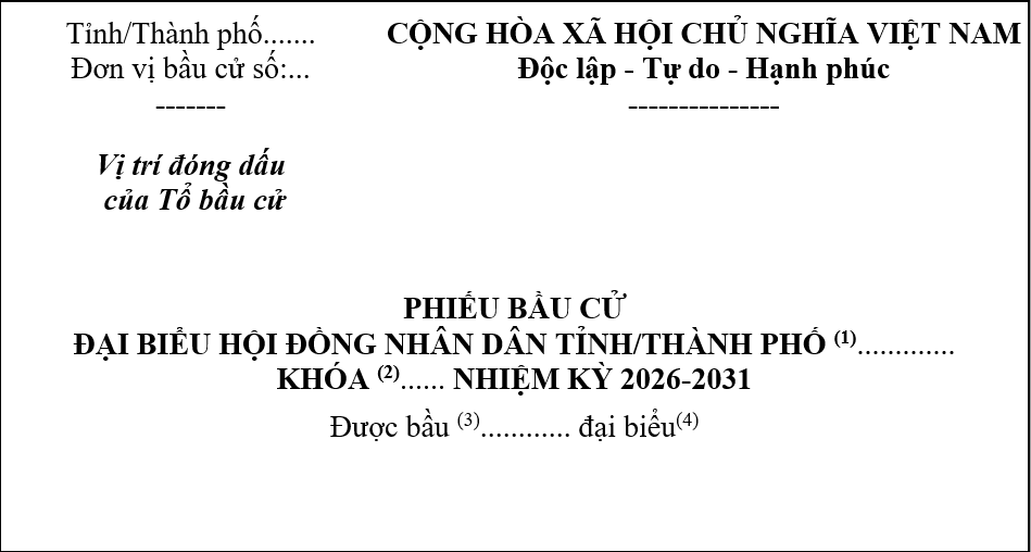Mẫu Phiếu bầu cử đại biểu Hội đồng nhân dân: Mẫu số 14/HĐBC-HĐND ban hành kèm theo Nghị quyết số 40/NQ-HĐBCQG ngày 29/9/2025 quy định mẫu văn bản hồ sơ ứng cử và việc nộp hồ sơ ứng cử; nội quy phòng bỏ phiếu trong công tác bầu cử đại biểu Quốc hội khóa XVI và đại biểu Hội đồng nhân dân các cấp nhiệm kỳ 2026 – 2031.